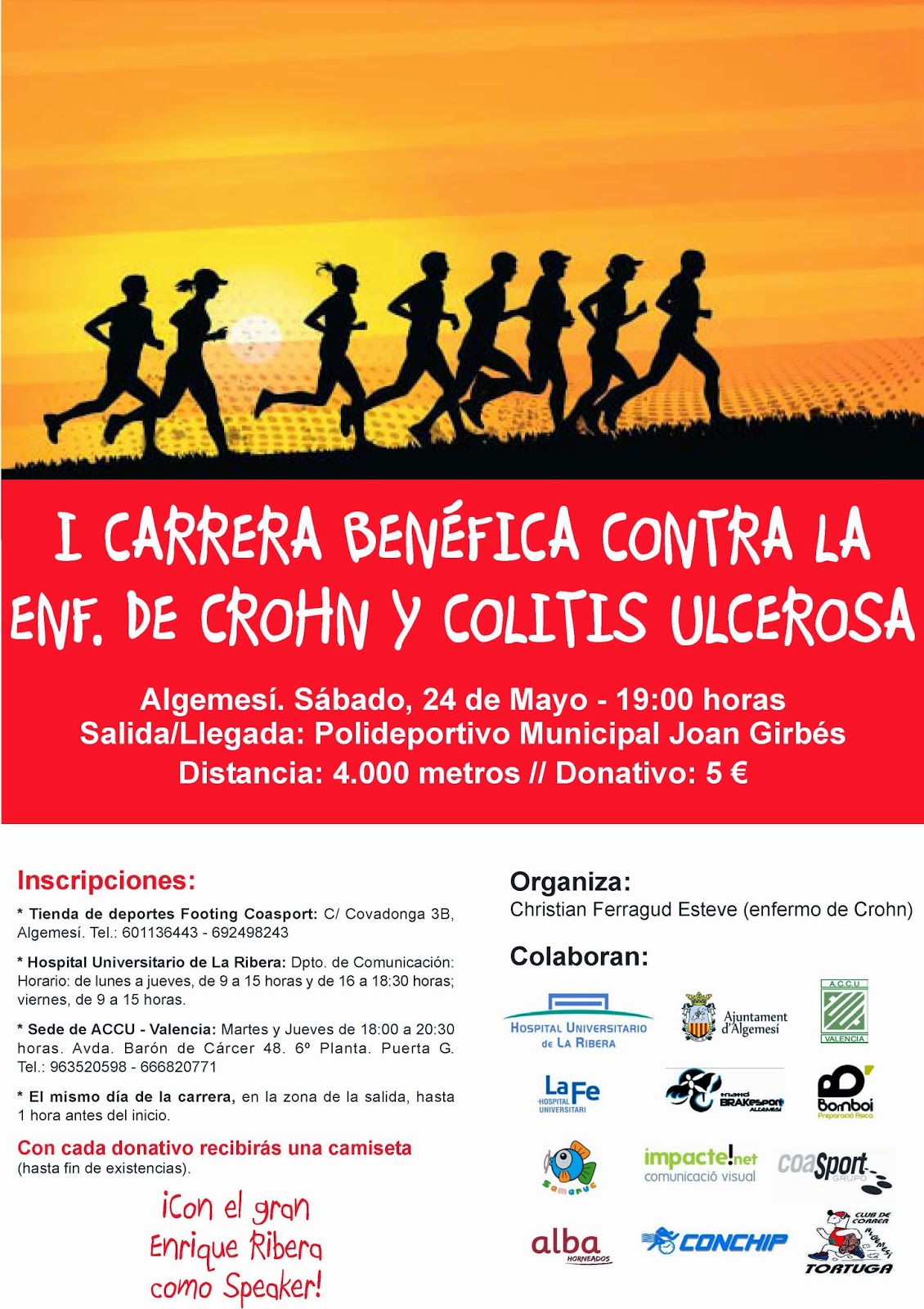 Iniciativa de un paciente de Crohn, el objetivo de esta carrera puramente benéfica es concienciar a la población sobre la incidencia de esta enfermedad y recaudar fondos que, posteriormente, el organizador donará a una línea de investigación del Hospital Universitario de La Ribera sobre estas patologías digestivas.
