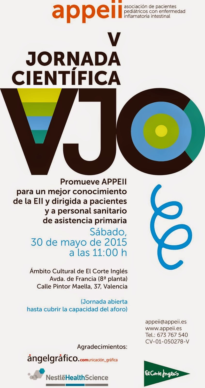 El próximo 30 de mayo, a las 11h., tendrá lugar la V Jornada Científica organizada por la Asociación de Pacientes Pediátricos con Enfermedad Inflamatoria Intestinal (APPEII). La misma se organizará en la 8ª planta de El Corte Inglés de la Avda. Francia (Valencia) y contará con la participación de los especialistas más reconocidos en la Comunidad Valenciana sobre la EII, tal y como viene asiendo habitual en estas Jornadas. Esperamos contar con la participación y asistencia de todos nuestros amigos y asociados, rogando máxima puntualidad, ya que el aforo es limitado.